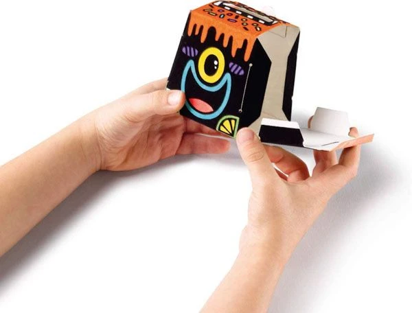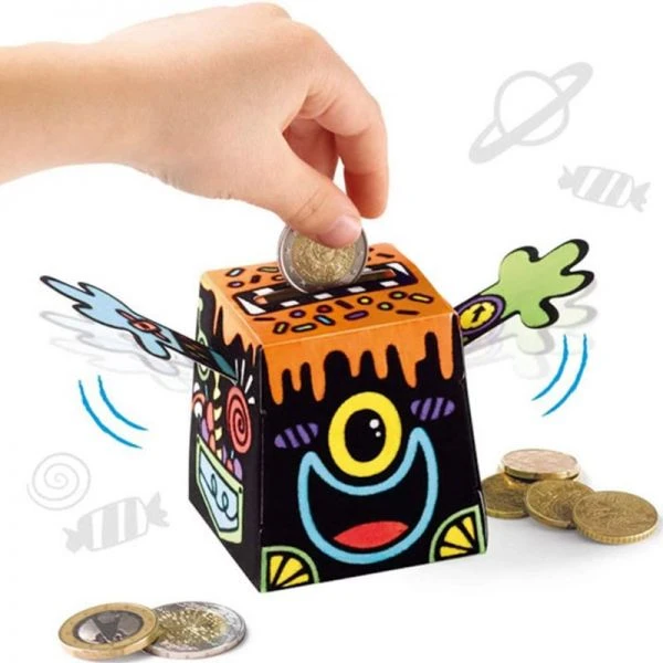 De armen van de spaarpot bewegen zodra er een munt in de spaarpot wordt gedaan.