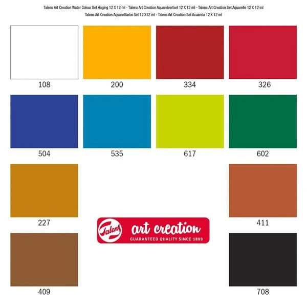 De waterverf kleuren in dit setje zijn: wit, geel, bordeaux, rood, twee tinten blauw, twee tinten groen, oranje, twee tinten bruin en grijs/zwart.